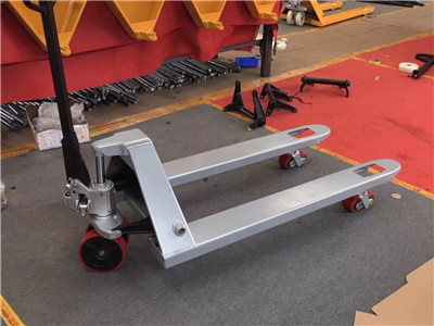 在空車運行時應將液壓式手動叉車適當打壓升起以免前輪軸支撐架與地面接觸磨損。
